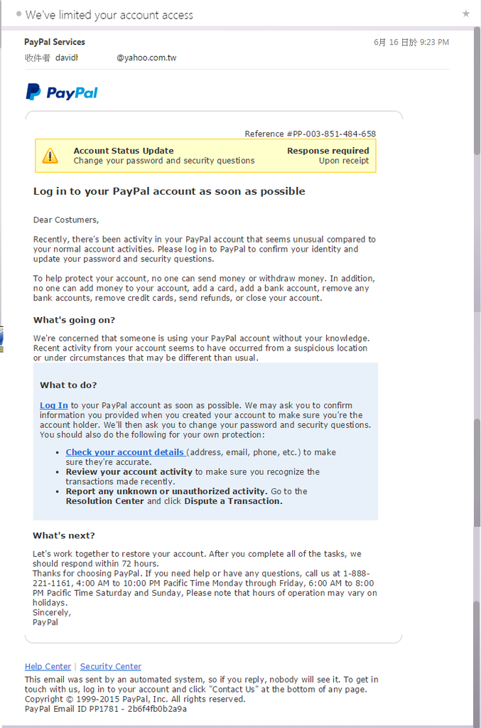 "Log in to your Paypal account as soon as possible"
