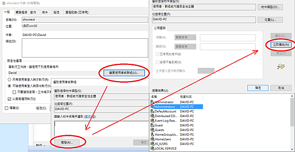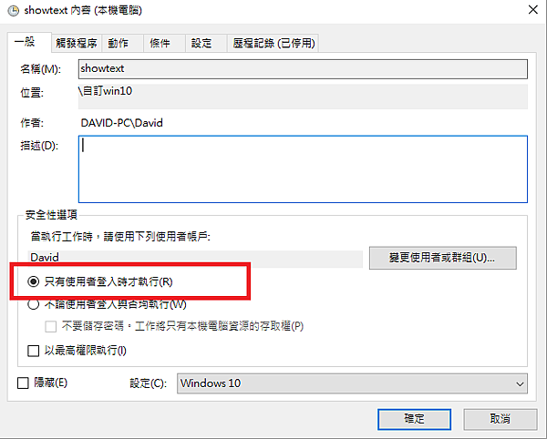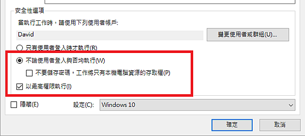 後來經過我的研究,發現關鍵在於 當工作執行時,請使用下列使用者帳戶 底下的設定!