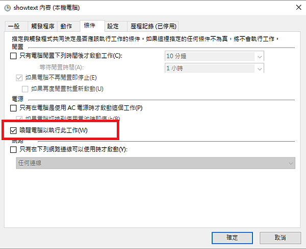 這時候就需要設定成 不論使用者登入與否均執行,並且開啟 以最高權限執行,最後再勾選條件底下的 喚醒電腦以執行此工作