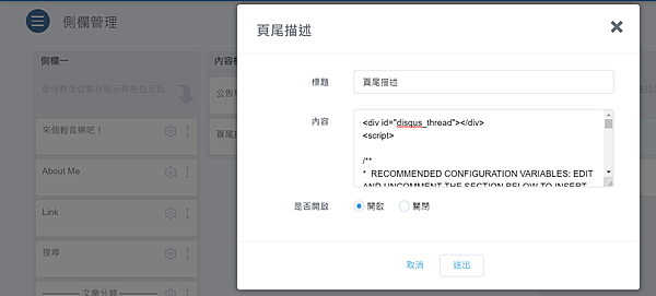 4. 接下來,前往 部落格後台 > 側欄管理 > 頁尾描述,然後把程式碼貼在這邊。